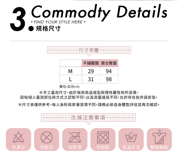 因每個人量測部位與方式之認知不同,以及測量道具不同,允許存在些許誤差值。※ 尺寸表數據範圍較廣,若表上無顯示,歡迎透過線上私訊功能聯繫我們咨詢。 ※ 由於每個人量測方式,以及個人體形與穿著習慣不同,請務必自行評估並確認後再行購買.最終仍依成立的訂單內容為準。 ※ 適合手洗、懸掛晾乾、不可熨燙、不可漂白、不可乾洗、不可烘乾。