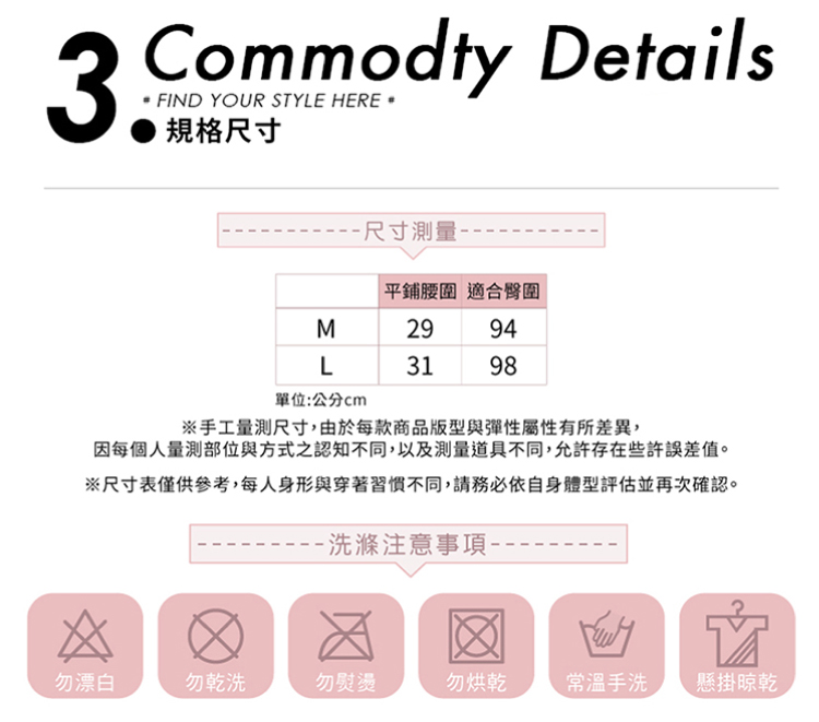 因每個人量測部位與方式之認知不同,以及測量道具不同,允許存在些許誤差值。※ 尺寸表數據範圍較廣,若表上無顯示,歡迎透過線上私訊功能聯繫我們咨詢。 ※ 由於每個人量測方式,以及個人體形與穿著習慣不同,請務必自行評估並確認後再行購買.最終仍依成立的訂單內容為準。 ※ 適合手洗、懸掛晾乾、不可熨燙、不可漂白、不可乾洗、不可烘乾。