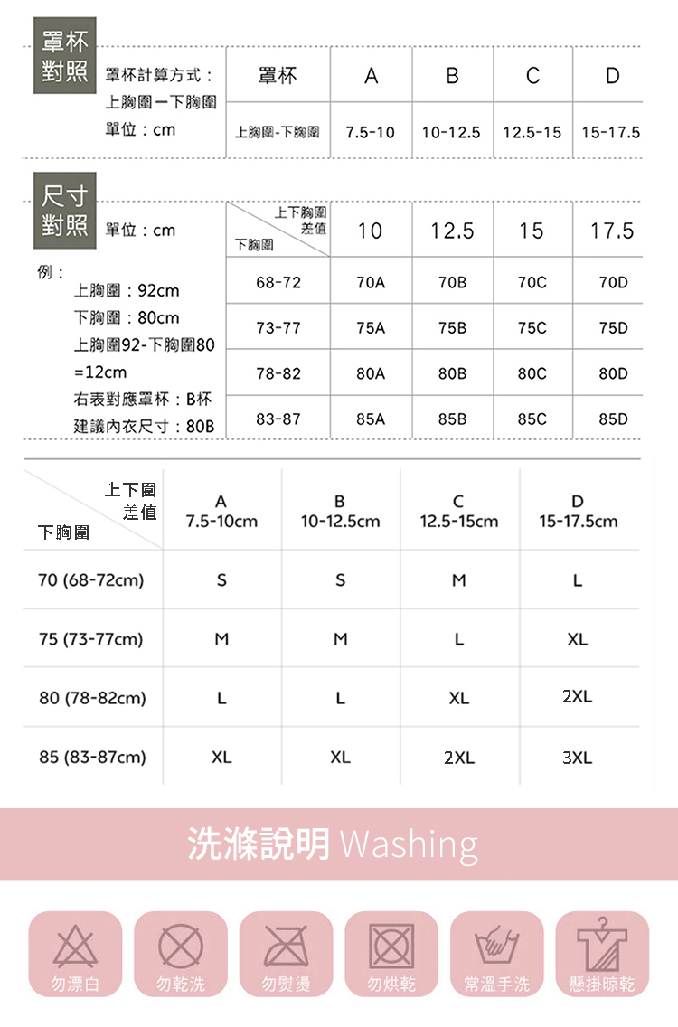 商品尺寸: 32/70AB(S)、34/75AB(M)、36/80AB(L)、36/80C(XL)、38/85C(2XL)、40/90C(3XL)