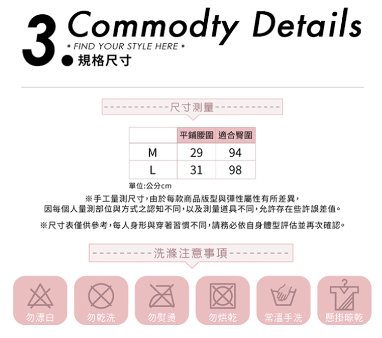 因每個人量測部位與方式之認知不同,以及測量道具不同,允許存在些許誤差值。※ 尺寸表數據範圍較廣,若表上無顯示,歡迎透過線上私訊功能聯繫我們咨詢。 ※ 由於每個人量測方式,以及個人體形與穿著習慣不同,請務必自行評估並確認後再行購買.最終仍依成立的訂單內容為準。 ※ 適合手洗、懸掛晾乾、不可熨燙、不可漂白、不可乾洗、不可烘乾。